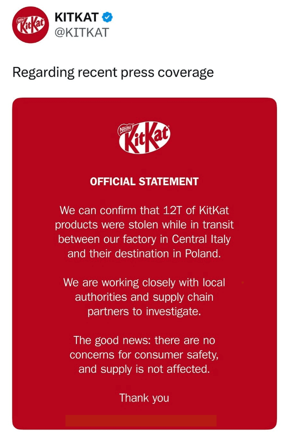 News broke that KitKat had officially been robbed of nearly half a million chocolate bars during routine transportation from a Nestle factory in Italy en-route to Poland just days before Easter.